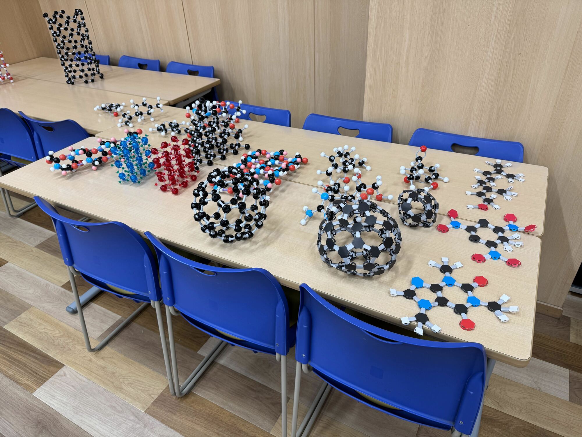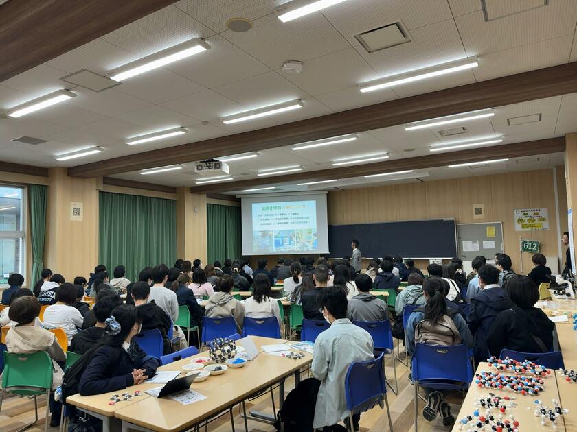 また、ペーパークラフトによる分子模型作り、身近な結晶の顕微鏡観察といった化学に関する体験と、環境に優しいプラスチックや電池材料の研究で使用する装置の展示を行いました。